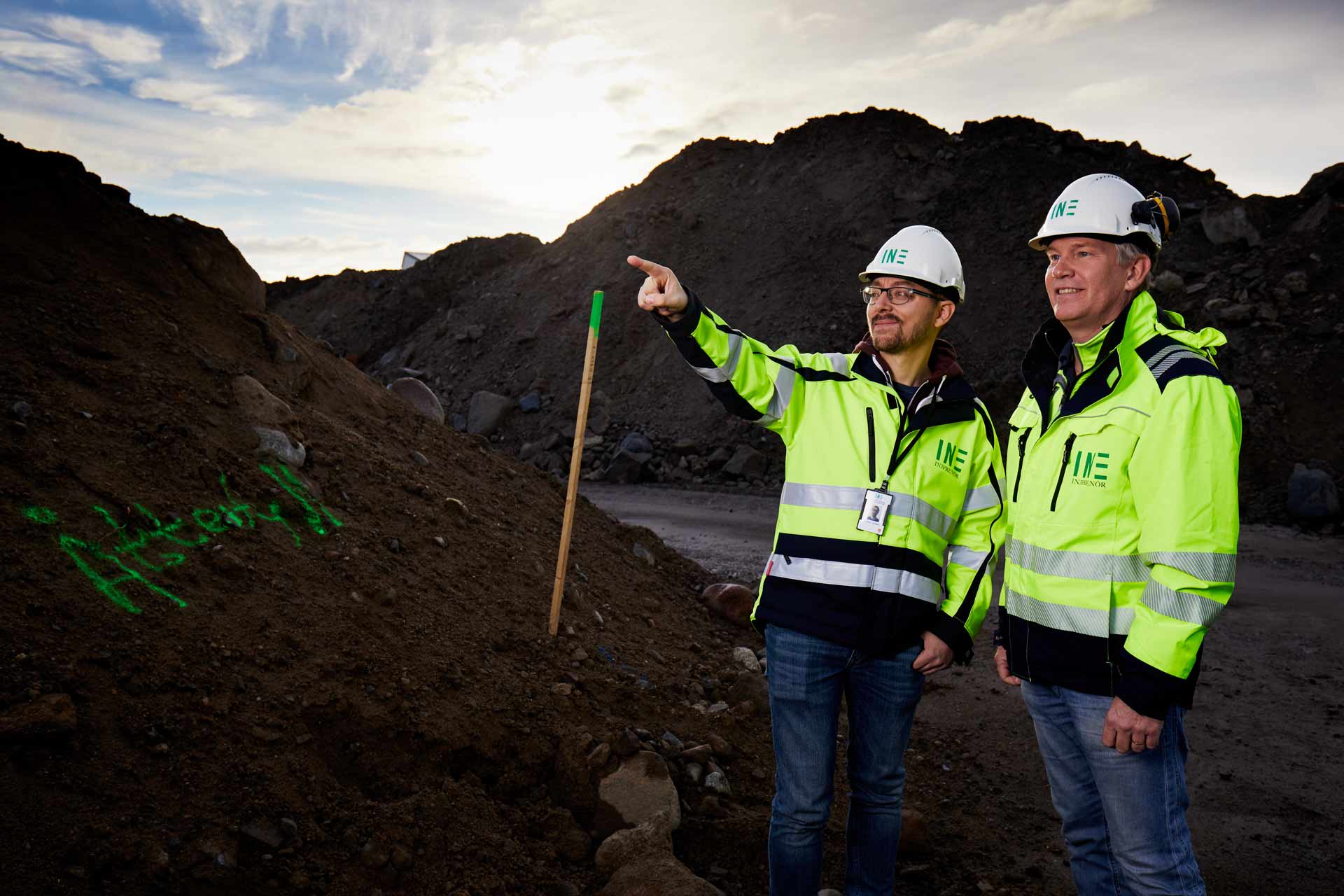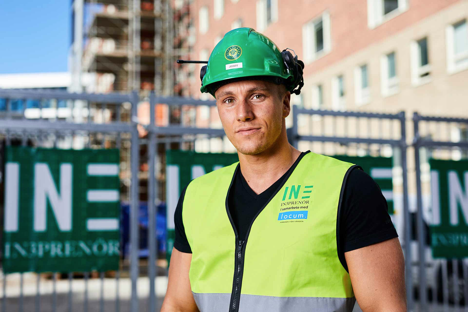 Porträtten visar medarbetare i arbetsmiljö, ofta med hjälm och skyddskläder. Fokus är på person och plats i samma bild. Materialet passar för reportage, webb och företagspresentationer.